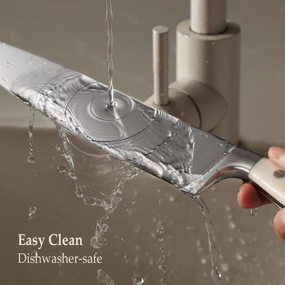 Discover this 14 – piece knife set that’s a must – have for any kitchen. Crafted from high – carbon stainless steel, these knives are precision – forged for durability and stain – resistance. The precise lasers on each blade ensure an optimal cutting angle for exceptional sharpness, making food preparation quick and efficient. The triple – riveted high – impact plastic handles offer a secure and comfortable grip, and full tangs with wide bolsters provide balance and control. The set includes a variety of knives for different tasks, from an 8 – inch chef knife to a 3.5 – inch paring knife, along with a six – piece steak knife set, kitchen shears, and a sharpening steel. It also comes with a 14 – slot hardwood storage block with nonslip feet. These dishwasher – safe knives are perfect for both amateur cooks and professional chefs, bringing convenience and functionality to your daily cooking routine.
