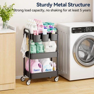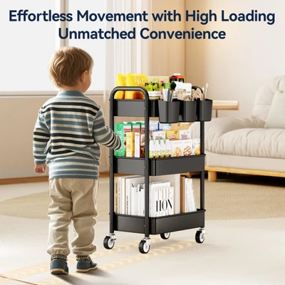 Discover a versatile and reliable storage solution! This 3 – tier rolling cart is made of 100% durable steel, ensuring sturdiness and a high load – bearing capacity of 66 LBS. Each of its 3 baskets can hold 22 pounds of items. With an ‘H’ shape dual column, it stays stable whether stationary or in motion. The expanded storage includes 3 hanging cups and 4 hooks for small items. It’s perfect for multiple uses, such as a craft cart in your hobby room, a cleaning cart in the utility area, or a snack cart in the living room. The large, heavy – duty wheels enable effortless movement, and the epoxy high – temperature baking process gives it an odorless, smooth, and chip – resistant finish. Installation is a breeze, taking only 20 minutes. This cart will bring order and convenience to your daily life, making it an essential addition to your home or office.