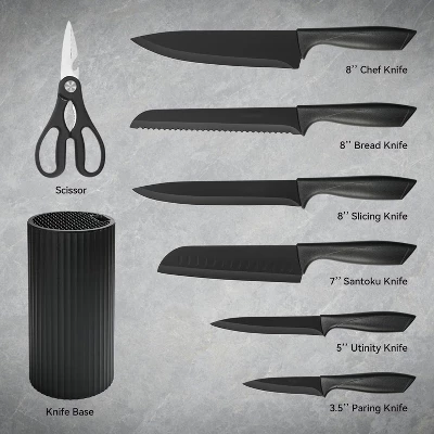 Upgrade your kitchen with this 8 – piece kitchen knife set. It’s a comprehensive set that includes an 8 – inch chef’s knife, a 7 – inch Santoku knife, an 8 – inch serrated bread knife, a 5 – inch utility knife, a 3.5 – inch paring knife, 1 kitchen shear, and a kitchen knife block. The knives are made of high – quality materials with a non – stick and rust – resistant black coating, which prevents steel oxidation and ensures a long lifespan. Each knife is carefully sharpened for smooth and efficient cutting. Whether you’re slicing, dicing, or chopping, these knives will be your great helpers. They are dishwasher – safe, so you can clean them easily and dry them for storage. The ergonomic design makes them comfortable to hold, reducing hand fatigue. Ideal for professional chefs or home cooks, this knife set will bring convenience to your daily cooking.