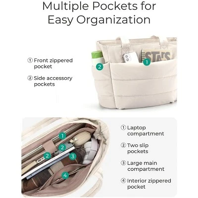 Discover the ultimate tote bag that combines style and functionality. This trendy puffer tote is a fashion statement, effortlessly complementing various outfits. It comes in two sizes: the standard one measures 16.1”L x 6.1”W x 12.2”H and the slim size is 13.2”L x 5.1”W x 15.7”H, with a 20L capacity to hold all your daily essentials like 15.6” laptops, umbrellas, and more. Weighing only 0.99 pounds and made of durable, soft taslan fabric, it’s incredibly lightweight and easy to carry. The zipper closure design keeps your belongings safe. It’s extremely versatile, serving as a work bag, laptop bag, gym bag, beach tote, casual shoulder bag, or travel bag, perfect for work, beach, travel, shopping, and gym. Upgrade your daily carry with this amazing tote!